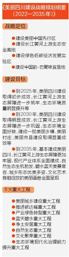 《綱要》明確,到2025年,美麗四川建設取得初步成效,長江黃河上游生態屏障進一步筑牢,生態環境質量明顯提升,綠色低碳經濟持續壯大,城鄉環境更加宜居,多彩人文之韻充分彰顯。
