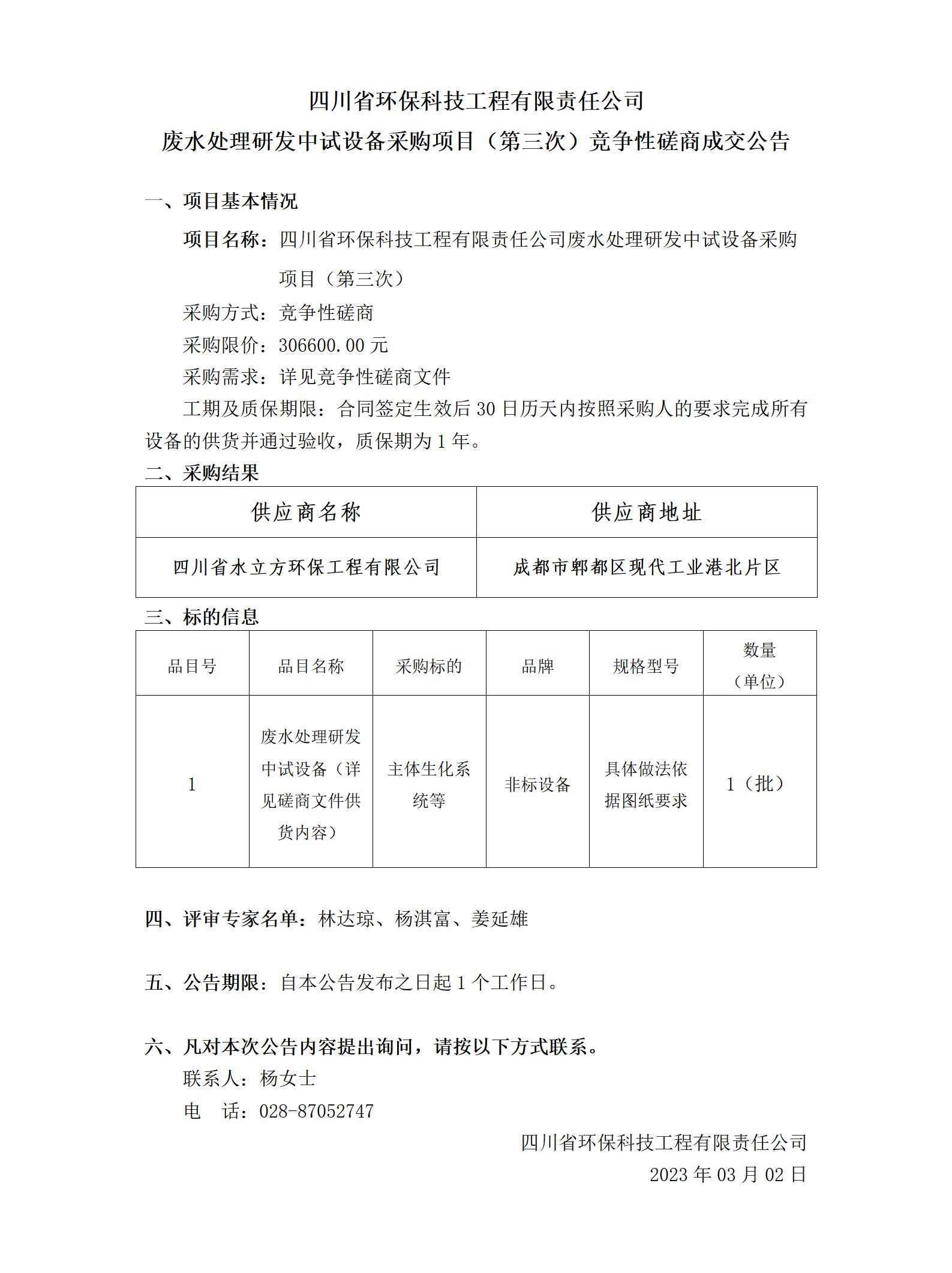 廢水處理研發(fā)中試設(shè)備采購項(第三次)競爭性磋商成交公告